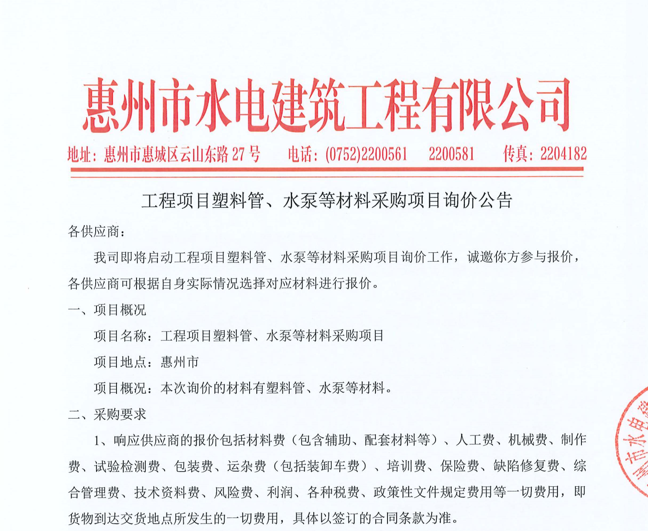 惠州市水電建筑工程有限公司成立于一九六四年四月,隸屬惠州市水務(wù)集團(tuán)有限公司,是一家國有綜合性施工企業(yè),主營水利水電工程、房屋建筑、市政工程等施工業(yè)務(wù)。公司擁有水利水電工程施工總承包一級(jí)、建筑工程施工總承包一級(jí)、市政公用工程施工總承包一級(jí)、公路工程施工總承包三級(jí),公路路基、路面及建筑裝修裝飾專業(yè)承包二級(jí),環(huán)保工程、機(jī)電安裝、河湖整治、輸變電工程專業(yè)承包三級(jí)等經(jīng)營資質(zhì)……